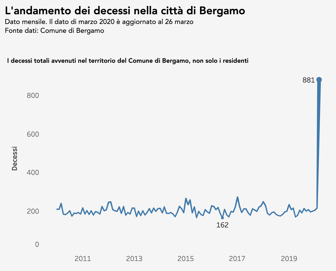 Come riportato anche da Isaia Invernizzi sull'Eco di Bergamo solo nel comune di Bergamo ci sono stati a marzo oltre 600 morti in più della media con solo una cinquantina classificati come COVID-19.