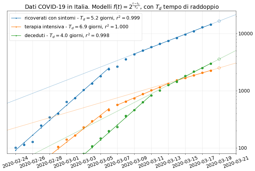 I valori attesi dai modelli esponenziali per ciascun dei dati che saranno riportati dalla Protezione Civile durante la conferenza stampa di oggi alle 18:00 sull'epidemia di COVID-19 sono: